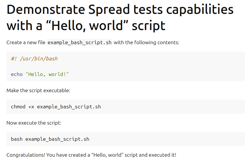 When crafting a tutorial, you may want to check that all the steps run smoothly and as expected. You can accomplish this with Spread – a system-wide test distribution that automatically assigns jobs to run tests in GitHub CI workflows. Using Spread, you can create a Spread test that runs through all the steps in your tutorial and outputs any failures that may occur. And with Sphinx-based directives, you can guarantee that your tutorial uses the same commands that Spread is testing.